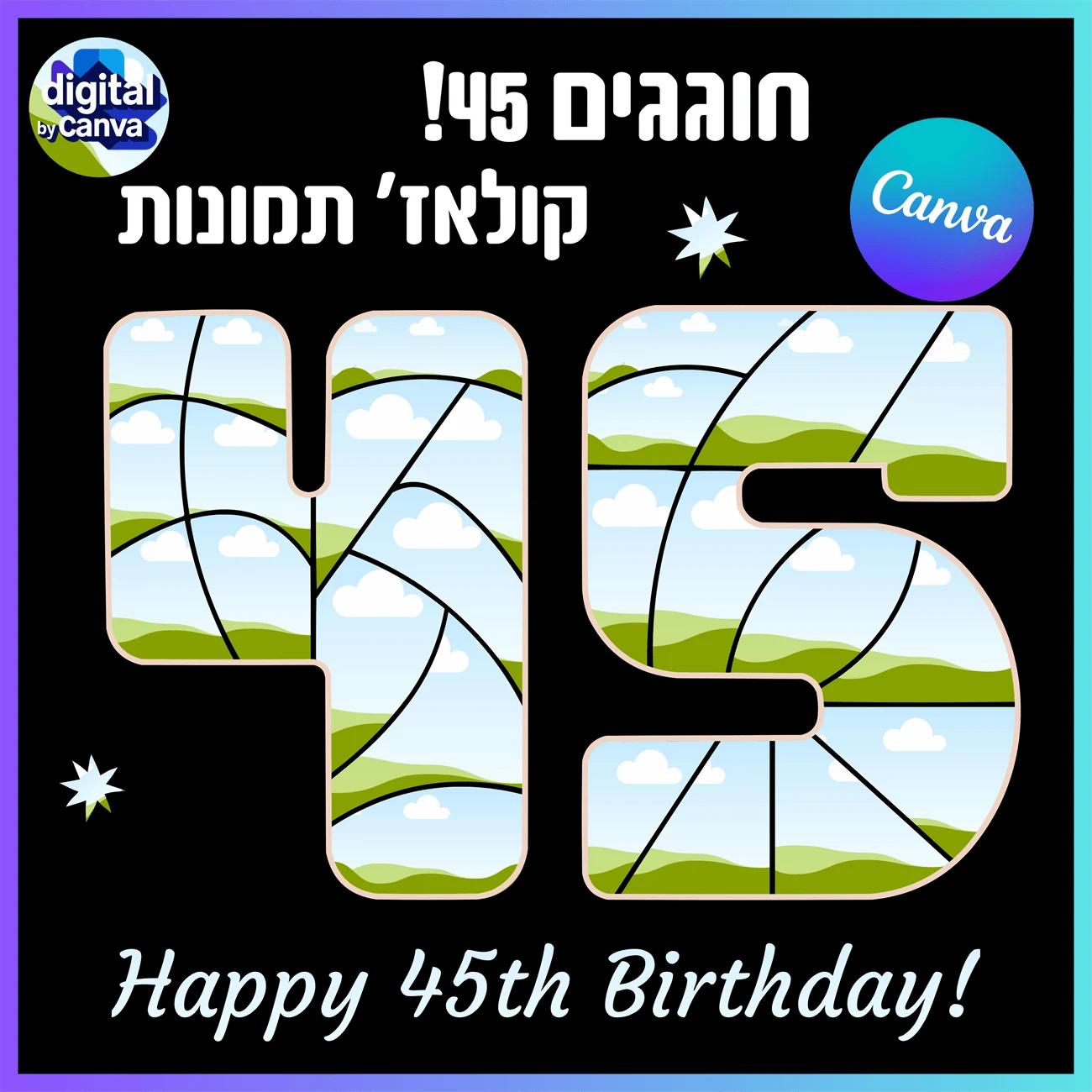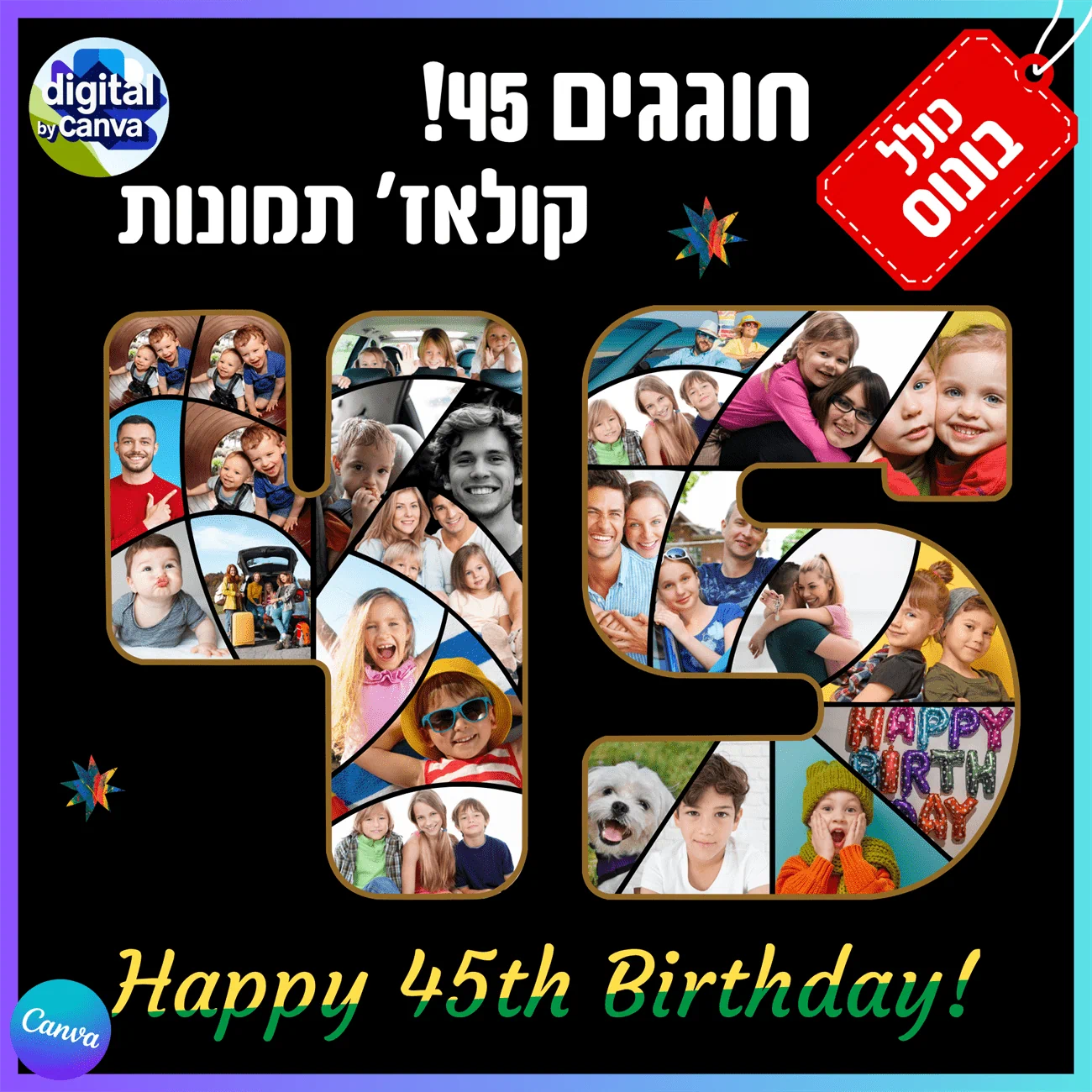 תבנית מעוצבת לעריכה אישית בקנבה - יוצרים קולאז' תמונות מהמם בצורת המספר 45!